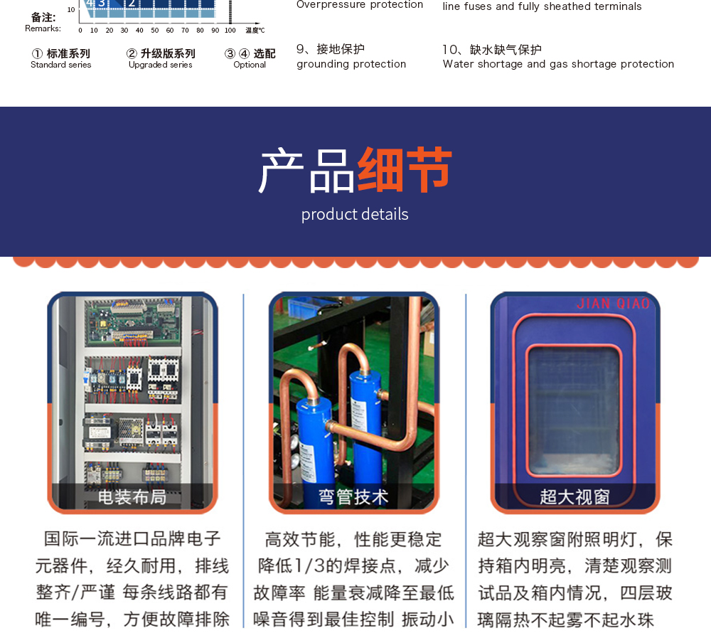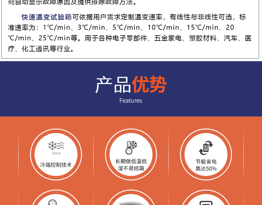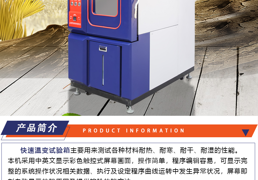 用途:快速溫變試驗箱主要用來測試各種材料耐熱、耐寒、耐干、耐濕的性能。本機采用中英文顯示彩色觸控式屏幕畫面,操作簡單,程序編輯容易,可顯示完整的系統(tǒng)操作狀況相關(guān)數(shù)據(jù)、執(zhí)