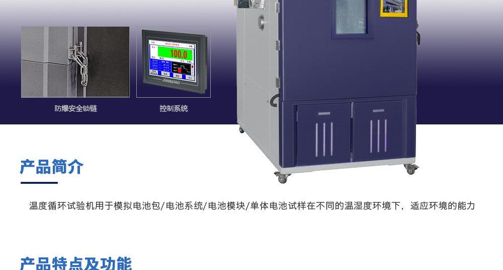 用途:溫度循環試驗機用于模擬電池包/電池系統/電池模塊/單體電池試樣在不同的溫濕度環境下,適應環境的能力