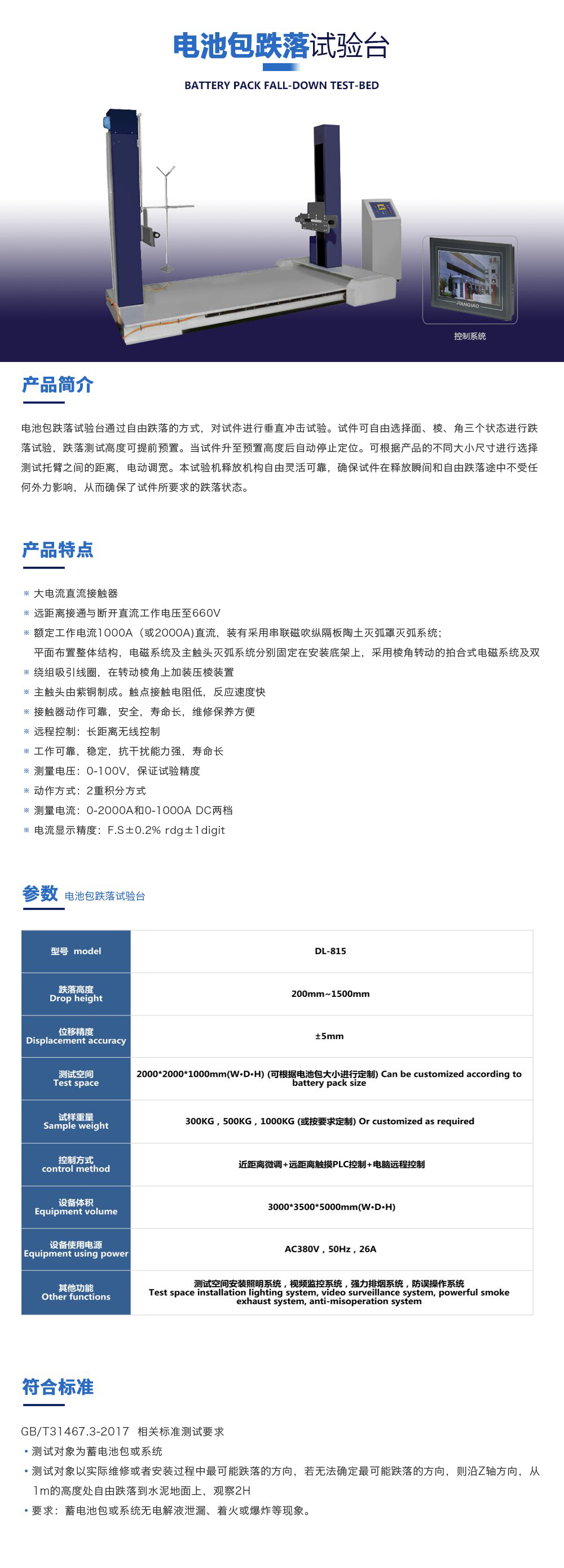 用途:電池包跌落試驗臺通過自由跌落的方式,對試件進(jìn)行垂直沖擊試驗。試件可自由選擇面、棱、角三個狀態(tài)進(jìn)行跌落試驗,跌落測試高度可提前預(yù)置。當(dāng)試件升至預(yù)置高度后自動停止定位