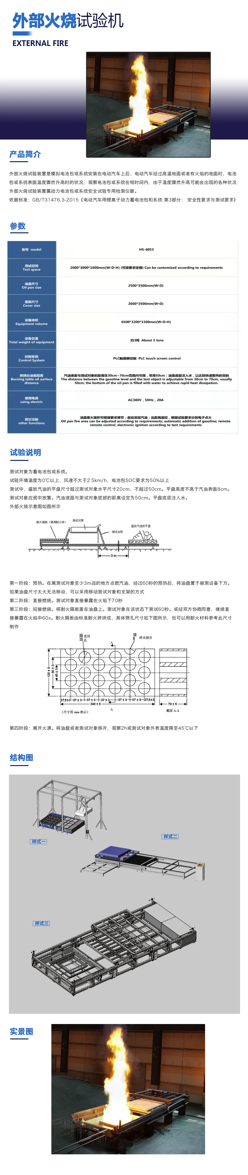 用途:外部火燒試驗(yàn)裝置是模擬電池包或系統(tǒng)安裝在電動(dòng)汽車上后,電動(dòng)汽車經(jīng)過(guò)高溫地面或者有火焰的地面時(shí),電池包或系統(tǒng)表面溫度驟然升高時(shí)的狀況,觀察電池包或系統(tǒng)在短時(shí)間內(nèi),由