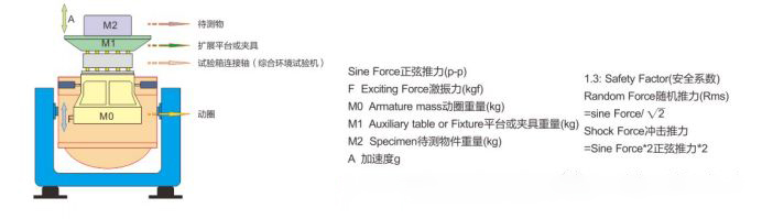 由于三軸電磁振動臺的主參數(shù)是以激振力大小命名與排序的,根據(jù)已知的參數(shù),利用∑ m x a= ( m1 + m2 + m3 + m4) x a計(jì)算出激振力的大小,并加1.3安全系數(shù),便能確定在加速度區(qū)域所需的激振力的大小,并以此作為選定相應(yīng)型號的依據(jù)。