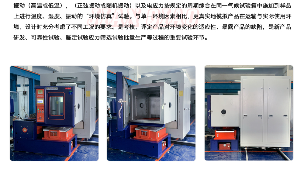 用途:垂直+水平振動高低溫三綜合箱(JQTHV-500):主要是試驗箱和振動試驗系統的綜合,試驗時將溫度、濕度、振動(高溫或低溫),(正弦振動或隨機振動)以及電應力按規定的周期綜合在同一氣候試驗箱中施加到樣品上進行溫度、濕度、振動的“環境仿真”試驗。